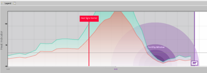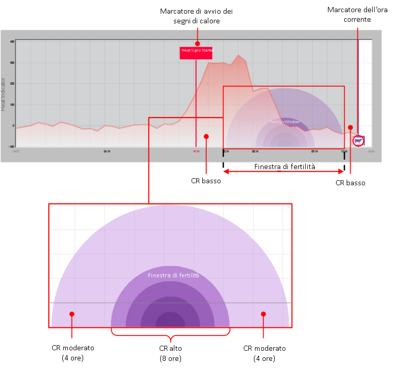 Utilizza il grafico della finestra di fertilità per una panoramica in tempo reale della posizione attuale dell'animale rispetto alla sua fase di calore e alla finestra di fertilità ottimale. Il grafico della finestra di fertilità mostra la probabilità di concepimento al momento attuale.