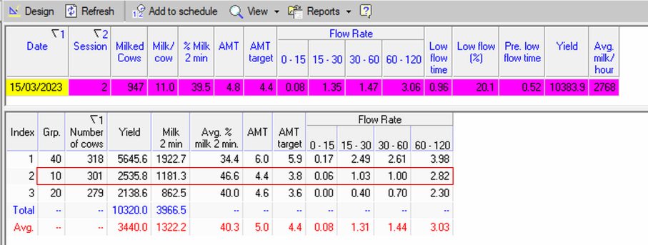 Preparation of the cows in Group 10 before milking was poor. This can be seen by opening the detailed group report and examining the following parameters: