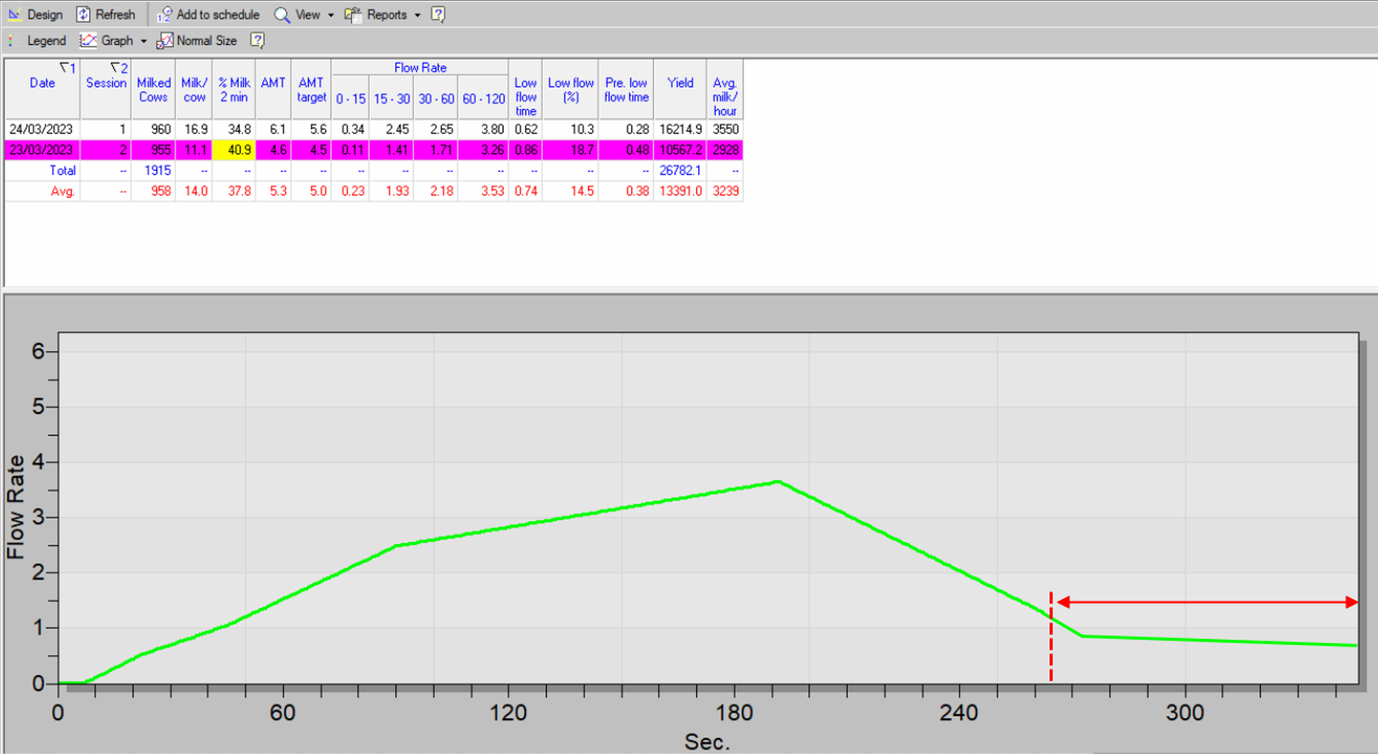 The red dash on the time line indicates the point in time, when the flow rate reached its optimal point for automatic cluster removal. However, in the example, the milking continues for almost an extra minute, even though the flow rate has dropped below 1 kg/minute. In such cases, check the Cluster Removal Parameters to ensure clusters are removed on time, prevent udder health problems associated to over milking, and increase parlor efficiency.