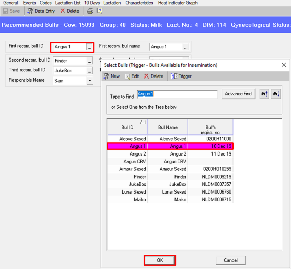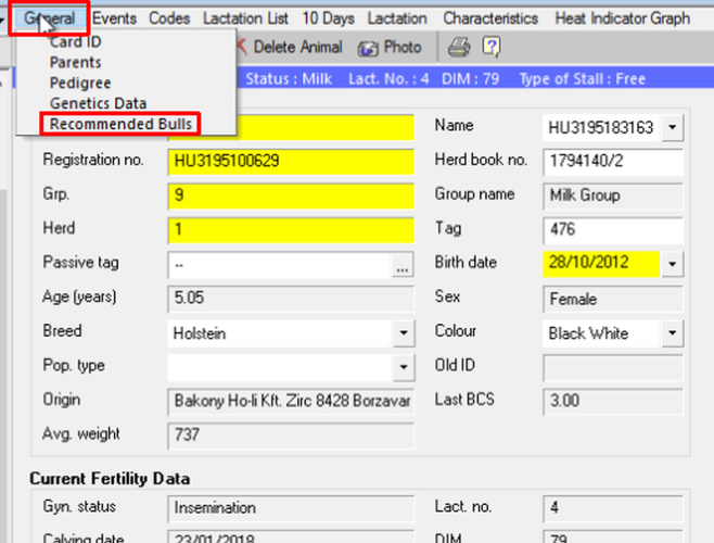 В карточке коровы, нажмите «Общее», затем нажмите«Рекомендованный бык».