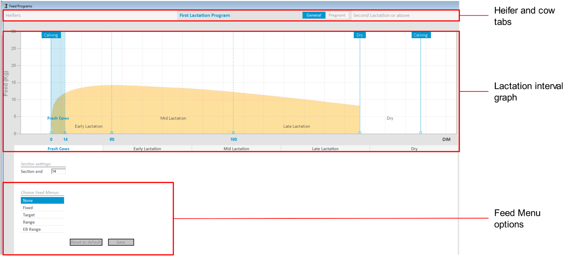 Программы кормления составляются в соответствии с этапами жизненного цикла животных. Каждая телка и корова в стаде связаны с определенным периодом лактации в течение жизненного цикла и получают суточную норму, рассчитанную в соответствии с рационом кормления, назначенным для этого периода.