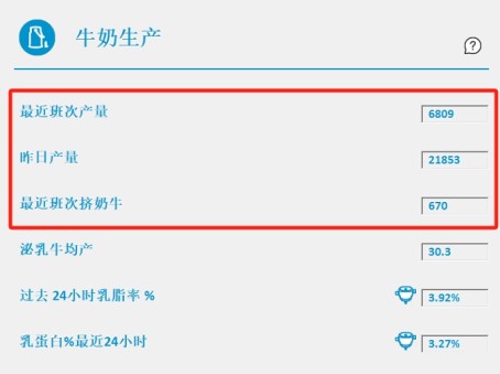 最近班次产奶 – 主界面数值显示上一个完成班次中记录的牛奶量(仅包括该班次中识别出的奶牛)。