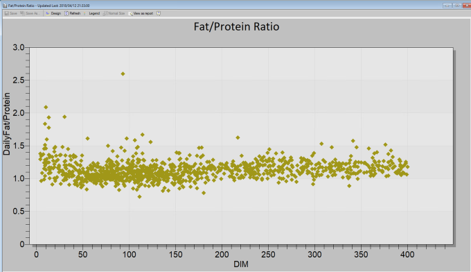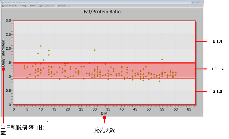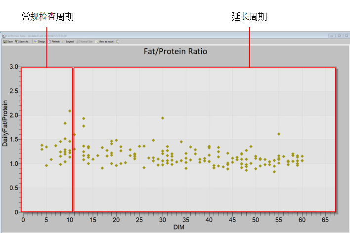 使用乳脂/乳蛋白比率图表,监测牧场的能量平衡状况。该图显示整个泌乳期所有泌乳牛的乳脂/乳蛋白比率,用于识别牧场的一般营养问题。