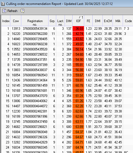使用淘汰顺序推荐报告,根据饲喂外收益 (IOF) 数据,识别并筛选出本周需从牧场中移除的表现最差奶牛(以红色标示)。