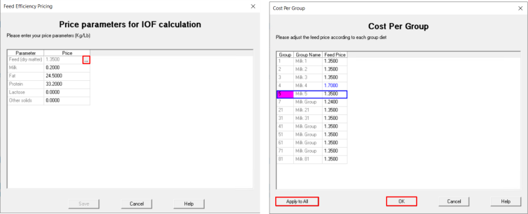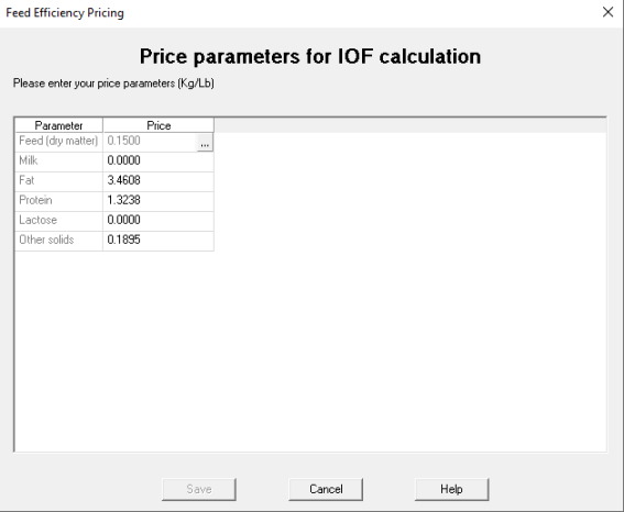 为了准确计算饲喂外收益 (IOF),必须及时更新饲料成本和牛奶价格数据(包括按牛奶、乳脂、乳蛋白、乳糖等指标支付的价格)。