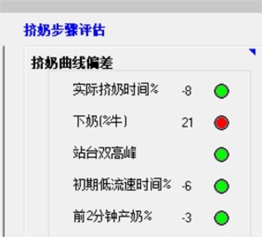 前2分钟内挤出的奶量占总产量的百分比。这也是下奶是否快速且顺畅的另一个指标。 绿灯表明奶牛受到了充分的刺激,易于下奶。 |
