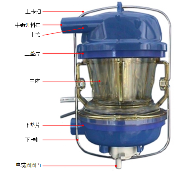 下盖和出料口——下盖包含控制牛奶排放阀门的电磁体,通过下盖和出料口将牛奶排放到牛奶管路中。