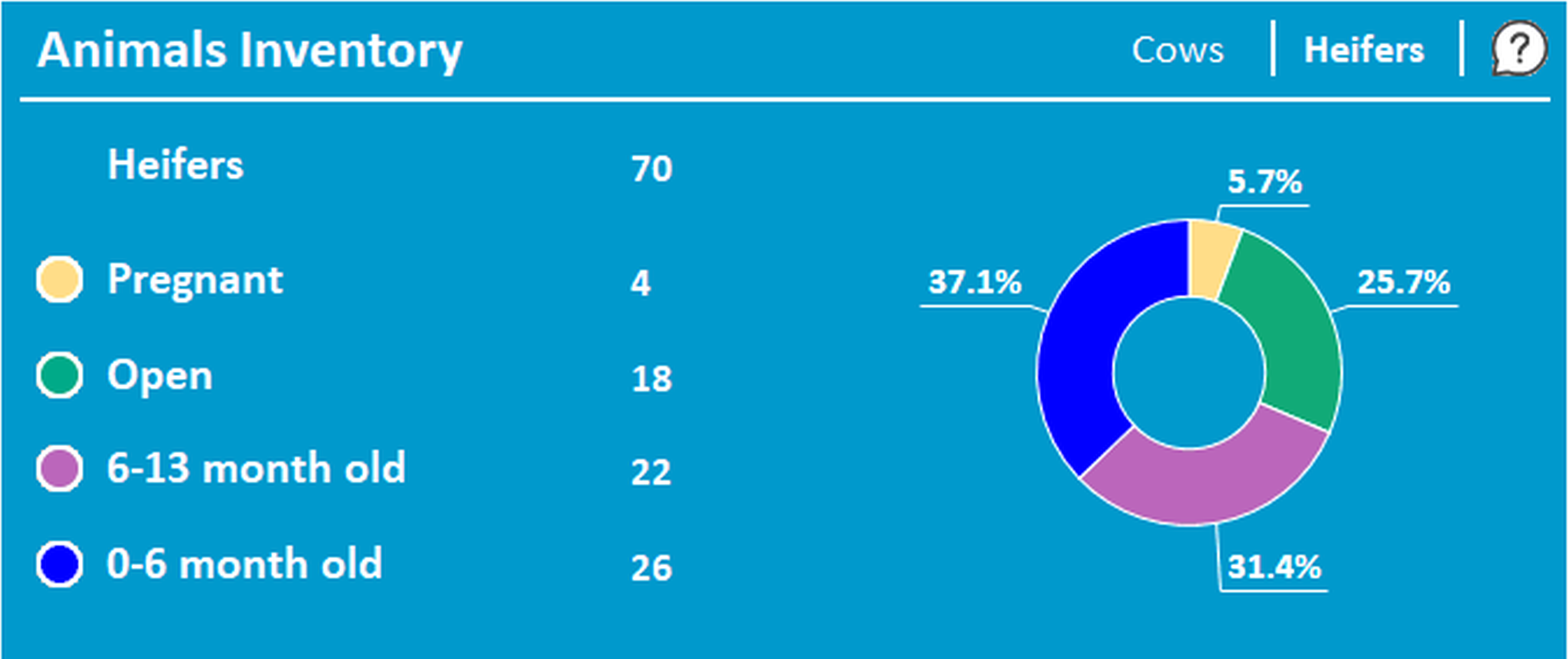 Open the Heifers tab to view the total number of heifers on the farm – distributed according to their age and fertility statuses.