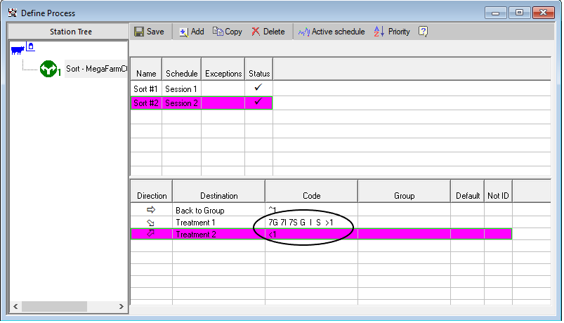 Sort schedules are set by default (in the Define Process utility) according to the default number of milking sessions set for the herd. For sorting cows from exclusive groups (groups under unique milk sessions timing) dedicated codes and dedicated sort schedules need to be set.