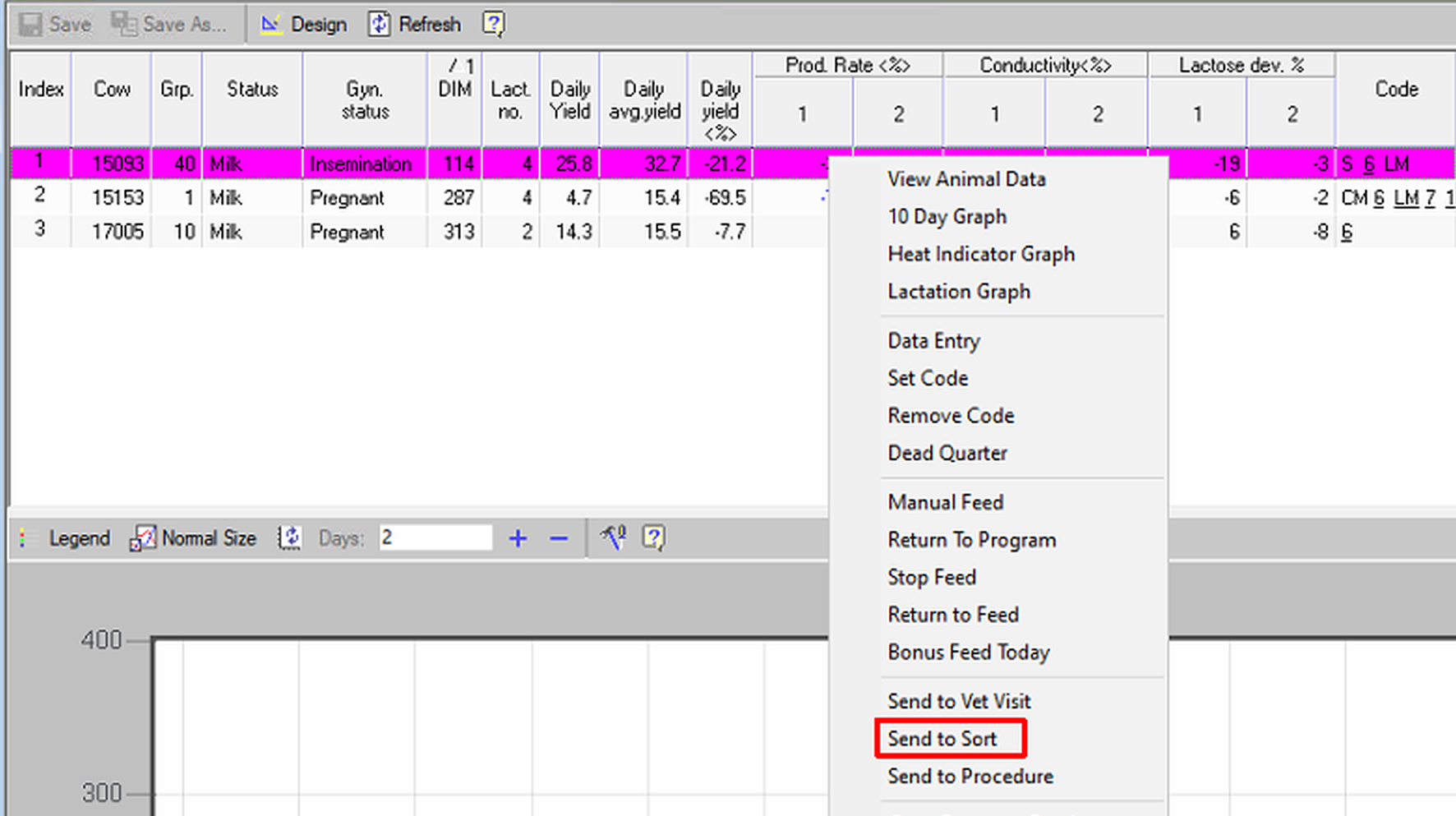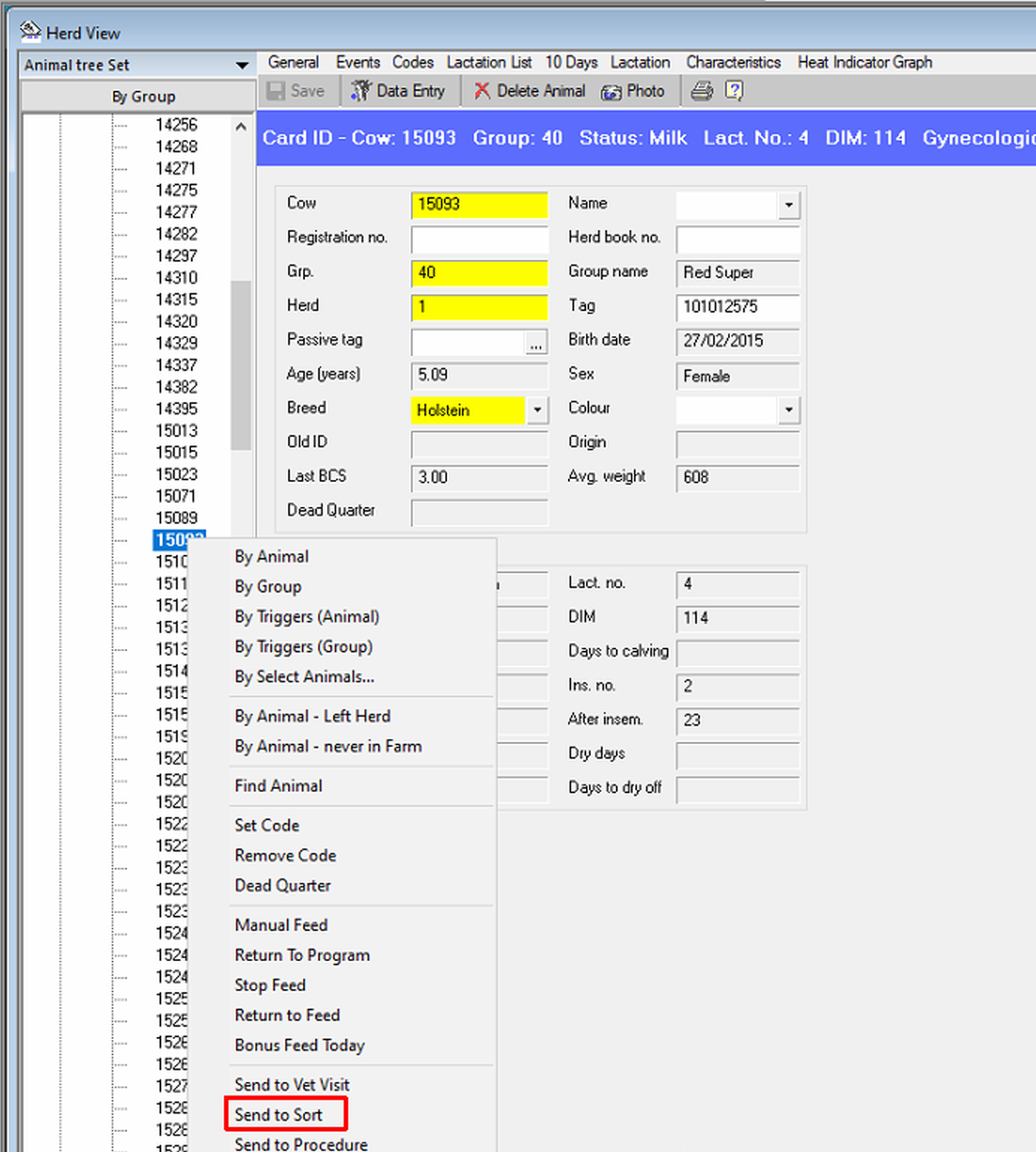 In the group list, right click the cow number, in the menu that opens, click Send to Sort.